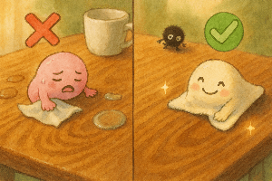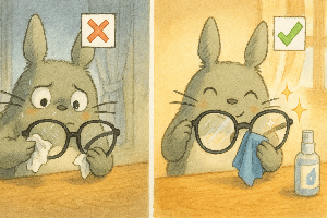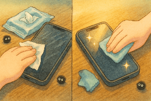 스마트폰 화면, 나무 가구, 안경 렌즈